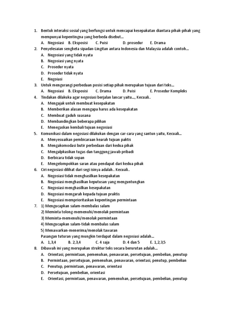 Pak, setelah lulus nanti saya ingin daftar sekolah di sma. bapak : Soal dan pembahasan teks negosiasi. Soal dan pembahasan teks negosiasi. Menyadari bahwa pihak anda memang masih banyak… Soal bahasa indonesia sma kelas x semester 2 kurikulum 2013 dalam bentuk pilihan ganda berisikan materi yang sama dengan soal essay b indonesia bagian pertama yaitu tentang teks negoisasi.